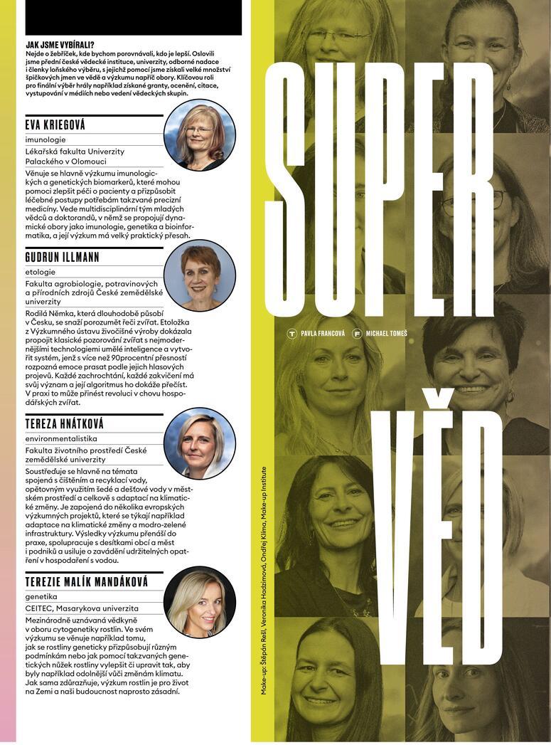 Nejde o žebříček, kde bychom porovnávali, kdo je lepší. Oslovili jsme přední české vědecké instituce, univerzity, odborné nadace i členky loňského výběru, s jejichž pomocí jsme získali velké množství špičkových jmen ve vědě a výzkumu napříč obory. Klíčovou roli pro finální výběr hrály například získané granty, ocenění, citace, vystupování v médiích nebo vedení vědeckých skupin.